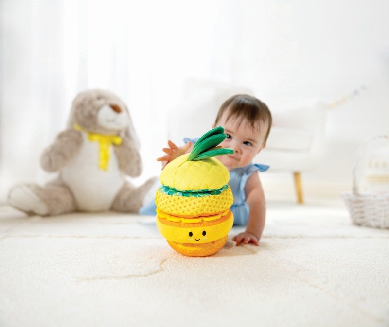 Miękka układanka w kształcie uroczego ananasa to wspaniała zabawka dla niemowląt. Każdy z 5 elementów zabawki różni się wielkością, powierzchnią oraz kształtem. Poszczególne elementy szeleszczą lub grzechoczą. Po nałożeniu wszystkich elementów powstaje uśmiechnięty ananas, który dziecko może ściskać, potrząsać lub gryźć. Podczas zabawy dziecko rozwinie zdolności manualne oraz poprawi koncentrację.
