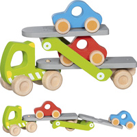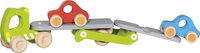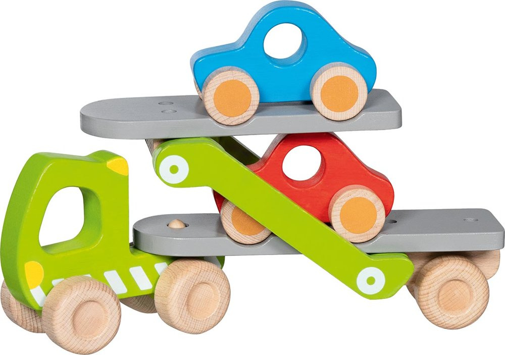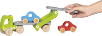 Drewniana laweta z 2 kolorowymi pojazdami. Z tym drewnianym transporterem samochodowym dzieci mogą nie tylko