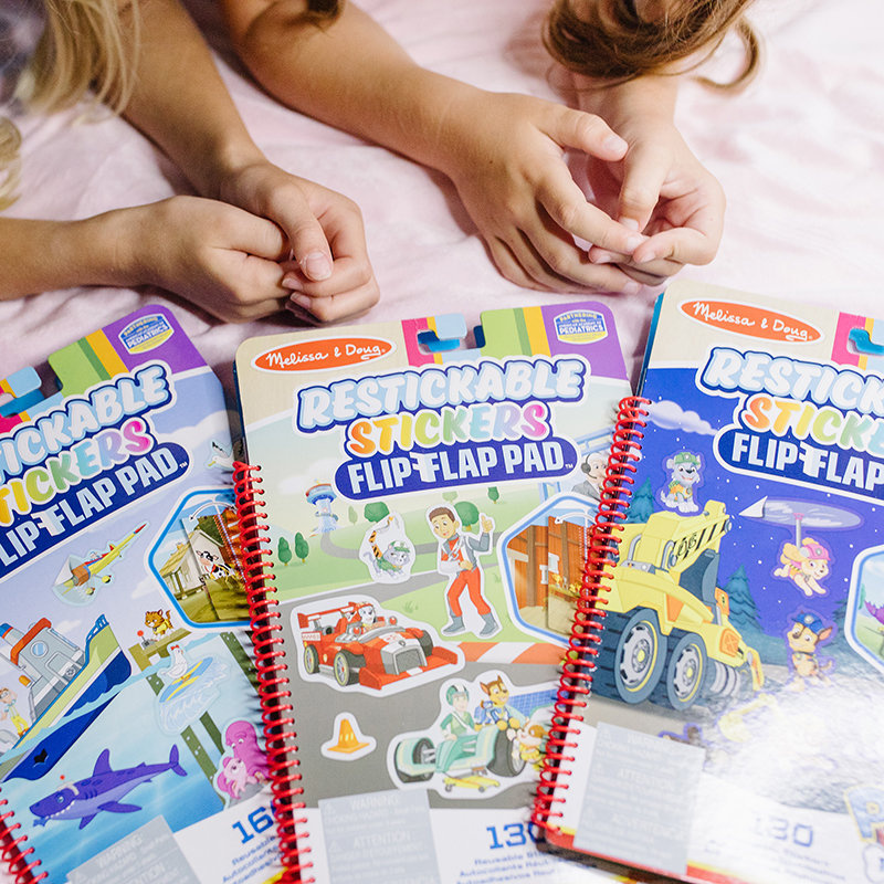 Propozycja marki Melissa and Doug dla każdego małego fana bajki Paw Patrol - książeczka do wyklejania z naklejkami wielorazowego użytku Restickable Stickers Flip-Flap Pad – Adventure Bay. Książka składa się z 5 scen, których losy leżą w rękach malucha. Za pośrednictwem naklejek dziecko może umieścić postacie psich bohaterów, a także rośliny, zwierzęta i inne przedmioty na każdej ze scen. Sceny posiadają dodatkowo zakładki, które zmieniają ich bieg wydarzeń. W zestawie znajdują się 164 naklejki.