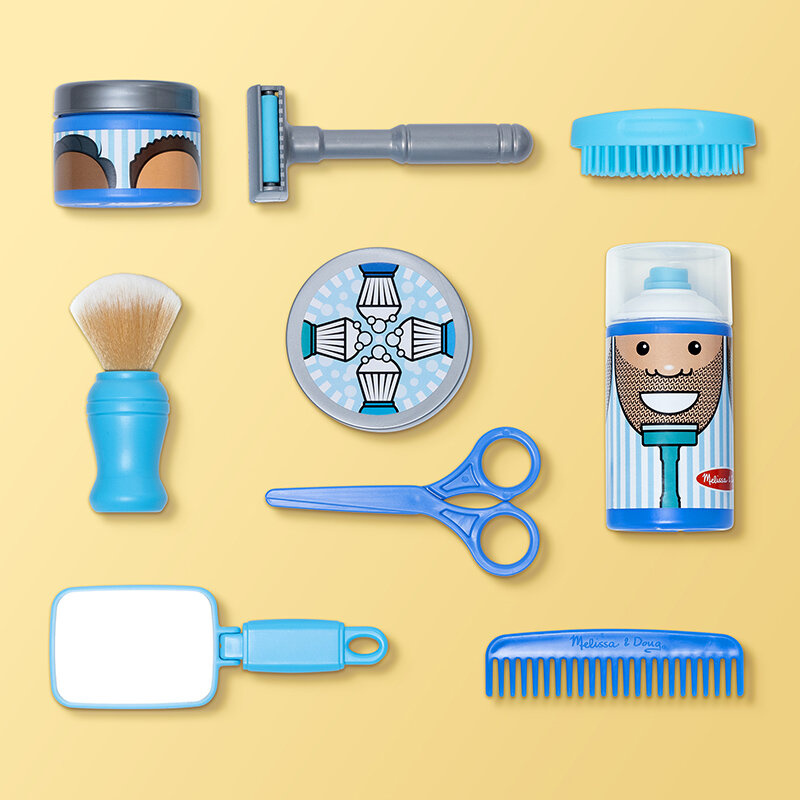 Zestaw małego fryzjera Melissa and Doug to składająca się z 15 elementów zabawka, pozwalająca na wcielenie się w rolę fryzjera, barbera lub klienta tychże salonów. Zestaw składa się m.in. z maszynki, nożyczek, grzebienia czy tez pianki, a te i pozostałe akcesoria mieszczą się w jednej torbie dołączonej do zestawu. Zabawka przeznaczona jest zarówno dla chłopca jak i dziewczynki w zakresie wiekowym 3-6 lat.