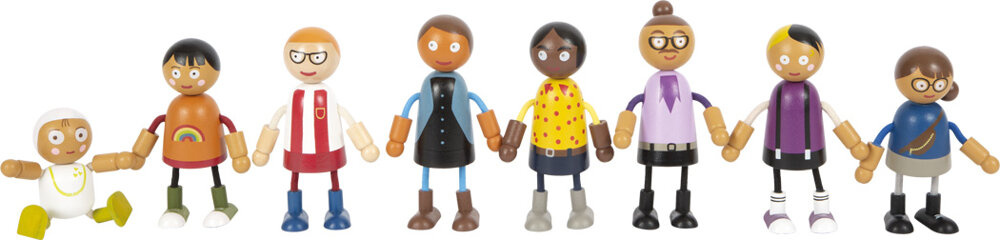 Zestaw drewnianych, giętkich lalek Rodzina z dzieckiem to kolejna odsłona lalek patchworkowych marki Small Foot będących niezależną zabawką lub też uzupełnieniem domku dla lalek. Zestaw zawiera 8 laleczek różnej płci i w różnym wieku, a wśród nich znajduje się niemowlę w nosidełku. Ta wykonana przy zastosowaniu solidnego drewna zabawka sprzyja maluchowi w zakresie łatwiejszego wejścia w relacje międzyludzkie. Te drewniane, ruchome laleczki przeznaczone są dla dzieci od 3 roku życia