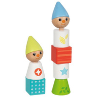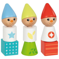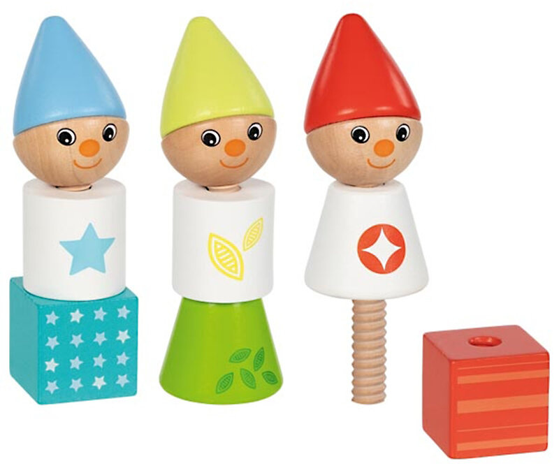 Drewniane Krasnale Goki to zestaw kolorowych klocków, które po nakręceniu na śruby stworzą 3 urocze figurki Krasnali. To właśnie konieczność samodzielnego ich złożenia przynosi dzieciom tak wiele radości. Zestaw składa się w sumie z 12 elementów: 9 barwnie lakierowanych klocków (głów, tułowia, podstawy) oraz 3 śrub w naturalnym kolorze drewna. Zabawka uczy m.in. rozpoznawania kształtów i kolorów, a także rozwija zdolności manualne. Ta drewniana zabawka sprawdzi się idealnie w rękach 2-latków lub dzieci starszych.