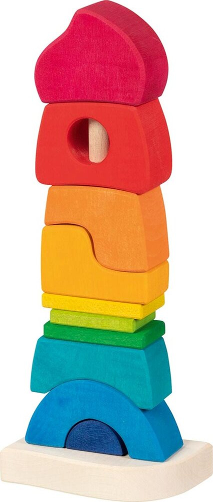 W zestawie drewnianych klocków dla dzieci znajduje się 10 elementów do dowolnego sortowania na słupku. Różnokształtne klocki dostępne są w intensywnych odcieniach tęczy.