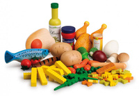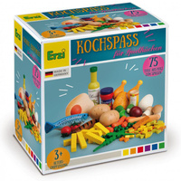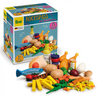 Duży, drewniany zestaw do zabawy w gotowanie to propozycja niemieckiej marki Erzi na udaną zabawę w szefa kuchni. Zestaw został wyprodukowany w Niemczech oraz posiada certyfikaty bezpieczeństwa CE oraz ASTM. Zestaw wykonany z drewna buku obejmuje aż 75 elementów. W zestawie znajdują się: 2 pieczarki, 1 jajko, 1 jajko sadzone, 2 pomidory, 1 cebula, 5 liści sałaty rukoli, 3 różyczki brokułów, 5 marchewek, 15 groszków, 1 kiełbasa z grilla, 1 frankfurterka, 2 paluszki rybne, 1 śledź, 1 pieczony kurczak do pokrojenia, 1 puszka soli, 8 frytek, 1 oliwa z oliwek, 21 makaronów, 1 sos pomidorowy.