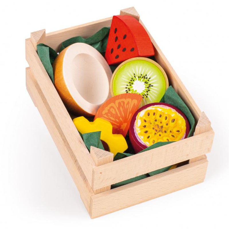 Skrzynka pełna kolorowych owoców tropikalnych to propozycja marki Erzi do zabawy w sklep lub przygotowywanie posiłków. Każdy z siedmiu elementów zestawu wykonano z drewna buku. Zestaw zawiera 6 realistycznie wyglądających owoców do zabawy umieszczonych w drewnianej skrzynce. Owoce znajdujące się w zestawie to: połówka kiwi, połówka marakui, połówka kokosa, plaster melona, plaster ananasa i plaster pomarańczy. Zestaw został wyprodukowany w Niemczech oraz posiada certyfikaty bezpieczeństwa CE oraz ASTM.