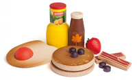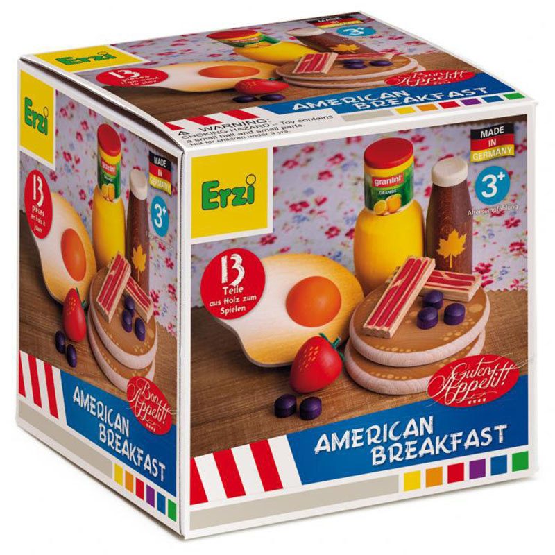 Drewniany zestaw do gotowania Amerykańskie Śniadanie to propozycja marki Erzi dla małych miłośników zabawy w odgrywanie ról. Z tym zestawem dziecko wcieli się w rolę kucharza, rodzica przygotowującego śniadanie dla rodziny czy właściciela hotelu Bed&Breakfast. Elementy zestawu wykonano z drewna buku i pomalowano bezpiecznymi farbami.