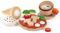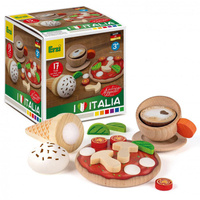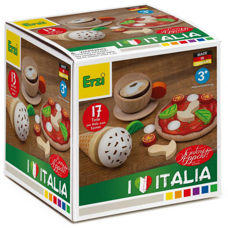 Miłe dla oka, bezpieczne i trwałe zestawy do zabawy w gotowanie marki Erzi to spełnienie marzeń każdego małego miłośnika gastronomii. Drewniany zestaw Italia zawiera 17 elementów, które pozwolą stworzyć własną pizzę oraz zaserwować pyszny deser. Każdy element zestawu wykonany został z drewna buku, a realistyczny wygląd jedzenia to zasługa wykorzystania bezpiecznych farb.