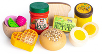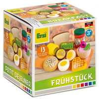 Drewniany zestaw "Śniadanie" marki Erzi pozwoli maluchowi przygotować dla domowników lub zabawek ten najważniejszy posiłek dnia. Każdy z 13 elementów zestawu wykonany został z bezpiecznego i trwałego drewna buku. Żywność do zabawy prezentuje się niezwykle realistycznie, co zapewni ogromną frajdę z zabawy. Zestaw zawiera: 1 bułkę ziarnistą, 1 kromkę chleba tostowego, 1 waflowy gofr w kształcie serca, 1 kostkę masła, 1 dżem truskawkowy firmy Schwartau, 1 słoik miodu, 2 połówki jajek do krojenia (z rzepem imitującym żółtko), 1 filiżanka herbaty owocowej, 1 malina, 1 listek mięty.