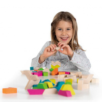 Drewniany zestaw wyjątkowych klocków GeoBlox MaxiMix to propozycja niemieckiej marki Erzi, która rozwija zdolności manualne u dzieci oraz umiejętność myślenia przestrzennego. Zestaw zawiera 60 klocków z drewna buku. Część z nich została pomalowana bezpiecznymi farbami, a część zachowała swój naturalnie drewniany wygląd. Klocki dostępne są w pięciu różnych kształtach opartych na formie trójkąta równobocznego, co przekłada się na łatwość tworzenia konstrukcji przez najmłodszych.