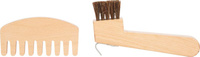 - drewniane narzędzia do oporządzania zabawkowego wierzchowca (grzebień, skrobaczka do kopyt, duża szczotka, miniszczotka).