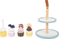 Drewniana, dwupiętrowa etażerka z babeczkami to kolejna propozycja marki Small Foot. Oprócz samej dwupoziomowej patery w komplecie znajdują się jeszcze: 4 babeczki, 4 kremówki, 1 świeczka, 1 ciasteczko, 1 truskawka, 1 jagoda. Ten przeznaczony dla każdego 3 latka zestaw znajdzie zastosowanie w zabawie w sklep, kuchnię, dom, restaurację itp.