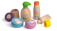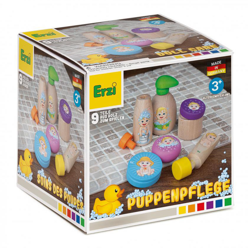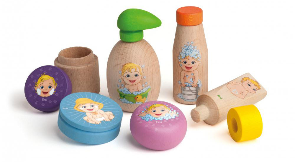 Każda dziewczynka dba o swoją lalkę jak o własne dziecko, dlatego marka Erzi stworzyła zestaw drewnianych kosmetyków dla lalek, dzięki któremu codzienna pielęgnacja lali będzie pachnącą przyjemnością. Zestaw zawiera 9 elementów (6 kosmetyków, w tym 3 ze zdejmowanymi pokrywkami). Wykonane z drewna buku kosmetyki to mydło w płynie, szampon do włosów, balsam do opalania w puszce, krem ochronny w tubce, krem do twarzy w opakowaniu oraz kostka mydła. Zabawka została wyprodukowana w Niemczech oraz posiada certyfikaty bezpieczeństwa CE oraz ASTM.