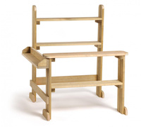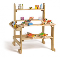 Drewniany sklep Erzi Outdoor to propozycja dla dzieci, które uwielbiają zabawę w odgrywanie ról, a w szczególności zabawę w sklep. Solidna konstrukcja z zaimpregnowanego drewna sosny oferuje mnóstwo miejsca na towar oraz do zabawy na zewnątrz. Bawić jednocześnie może się kilkoro dzieci. Spory regał pomieści gotowe na sprzedaż produkty, a transakcji można dokonywać przy ladzie. Stoisko do zabawy w sklep od Erzi posiada certyfikaty jakości CE oraz ASTM.