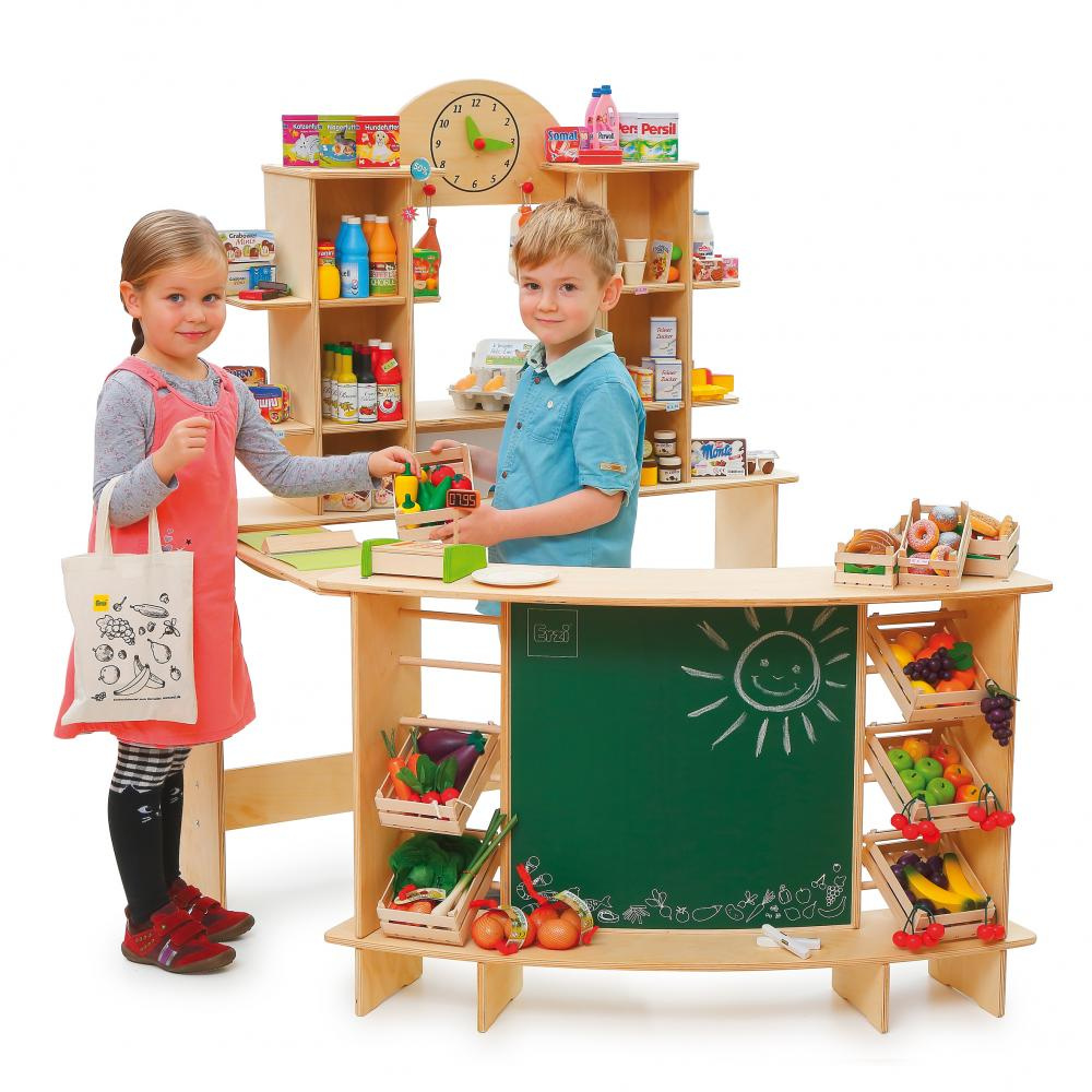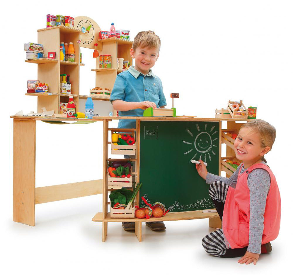 Drewniany sklep Erzi Shop Premium XL to gwarancja znakomitej zabawy w sprzedaż lub wyprawę po codzienne sprawunki. Stoisko wykonane zostało z solidnej sklejki brzozowej. Na wyposażeniu sklepu znajduje się zegar z ruchomymi wskazówkami, lodówka do przechowywania artykułów wymagających niskiej temperatury, tablica kredowa do zapisywania informacji o promocjach, liczne półki, w tym regulowane, a także drewniane skrzynki na owoce i warzywa. Sklep dla dzieci Erzi Shop Premium XL wyprodukowany został w Niemczech, a o jego wysokiej jakości świadczą certyfikaty CE i ASTM.