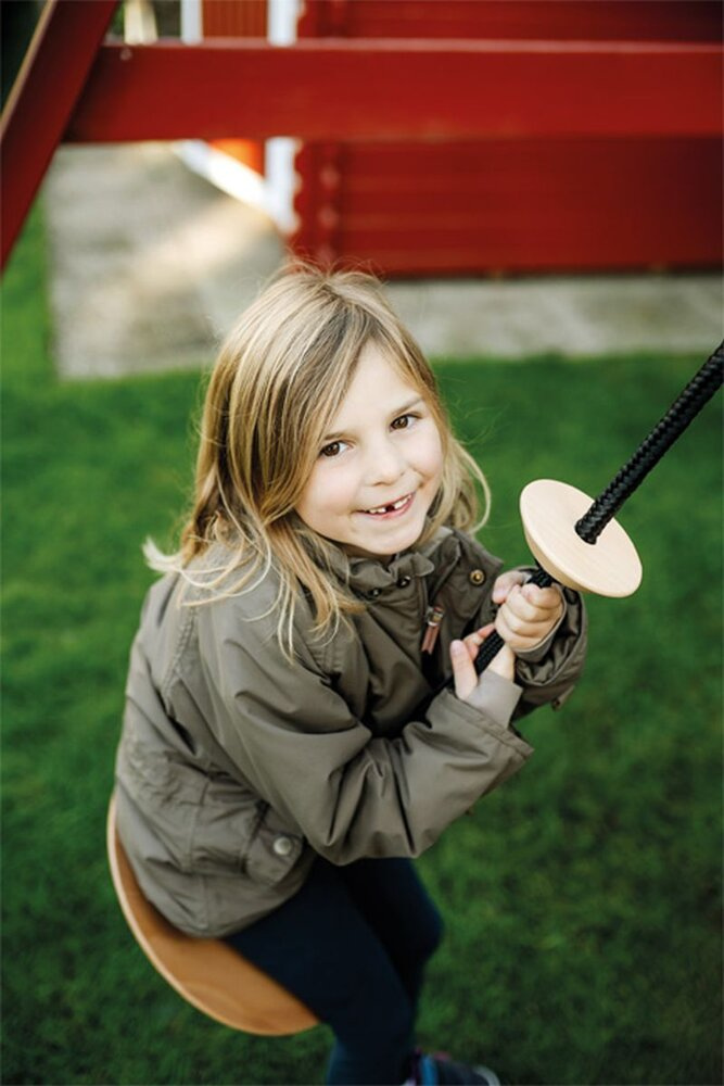 Wytrzymała lina do wspinaczki zintegrowana została z trzema okrągłymi podnóżkami z drewna, które ułatwiają podciąganie.