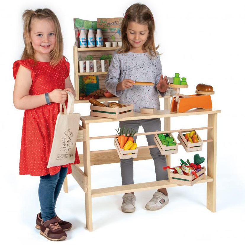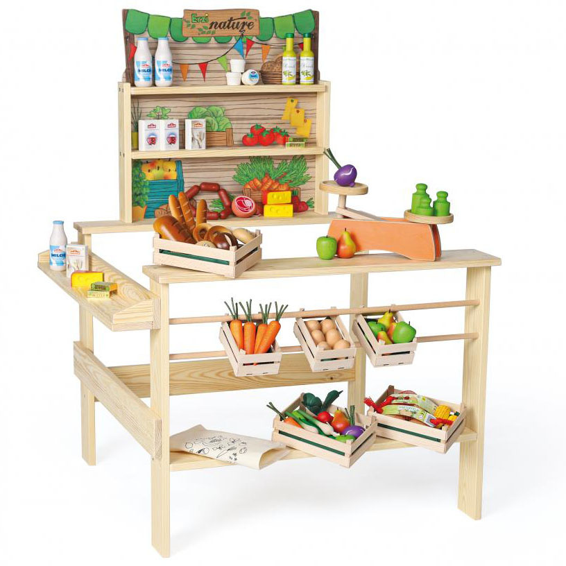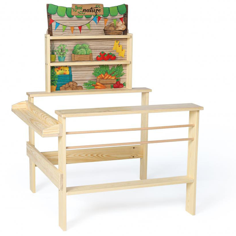 Stragan drewniany dla dzieci Erzi Grocer’s Shop Organic Market sprawi, że zabawa w sprzedaż miodu z własnej pasieki czy owoców i warzyw z własnej uprawy będzie maksymalnie realistyczna. Stragan posiada solidną i stabilną konstrukcję z drewna sosny i sklejki brzozowej. Stanowisko do zabawy w targ posiada liczne półki, na których można eksponować towar. Panel z kolorową grafiką stanowić będzie reklamę oferowanych produktów. Przy długiej ladzie klienci mogą płacić za zakupione produkty. Stragan posiada certyfikaty jakości CE oraz ASTM.