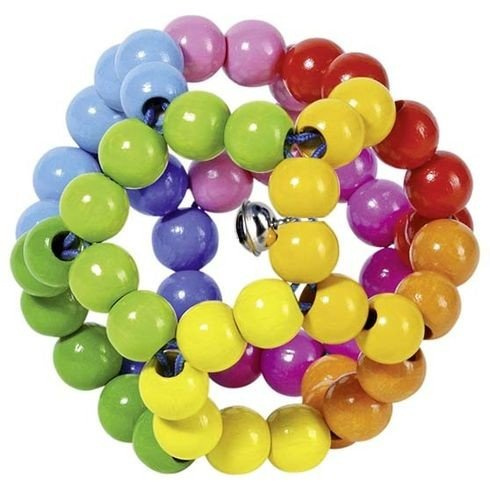 Kolorowa kula to grzechotka dla dziecka wykonana z drewnianych koralików połączonych sznureczkiem. Wewnątrz umieszczono dzwoneczek. Grzechotkę można ściskać w dowolną stronę.