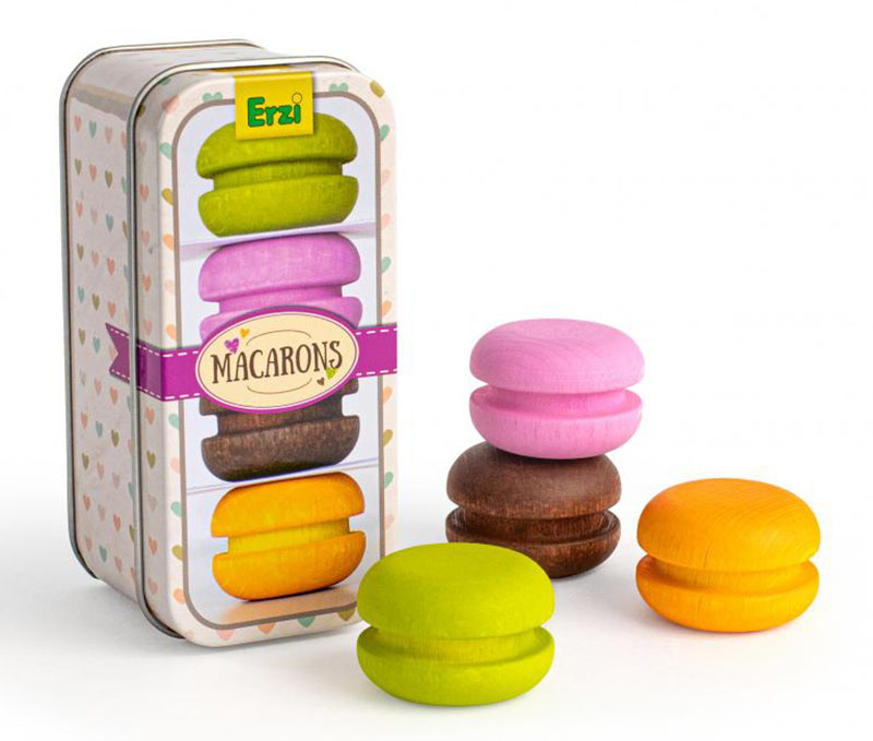Drewniane makaroniki Erzi Macaroons in a Tin to realistycznie wyglądające ciasteczka do zabawy w kawiarnię, sklep lub pieczenie słodkości. Metalowe opakowanie skrywa cztery makaroniki wykonane z drewna buku. W zależności od koloru makaroniki mają różne smaki, dzięki czemu klienci cukierni będą mogli wybrać swój ulubiony. Produkt został wyprodukowany w Niemczech oraz posiada certyfikaty jakości CE i ASTM.