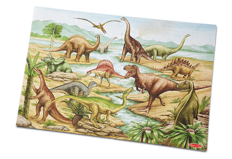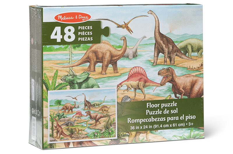 48 elementowe puzzle podłogowe dla dzieci "Dinozaury" Melissa and Doug to prawdziwa gratka dla fanów Dinozaurów. Dzięki nim maluch dobrze wykorzysta swój czas, zapoznając się ze wieloma gatunkami tych niesamowitych, historycznych stworzeń. Po złożeniu obrazek jest dość duży, a własnoręczne stworzenie tak okazałych obrazów z pewnością przyniesie dziecku olbrzymią satysfakcję. Te wyjątkowe puzzle powstały z solidnego, grubego kartonu z certyfikatem FSC. Projektant zestawu za sprawą zastosowanego systemu Easy Clean, zadbał o stworzenie optymalnych warunków do utrzymania puzzli w czystości. Polecamy te puzzle dla każdego małego miłośnika prehistorii.