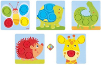 Edukacyjna gra dla dzieci sortowanie kolorów Goki zawiera: 5 drewnianych plansz z przyjazną grafiką ze zwierzątkami, pulę kolorowych klocków-puzzli do dopasowywania, kostkę do gry.