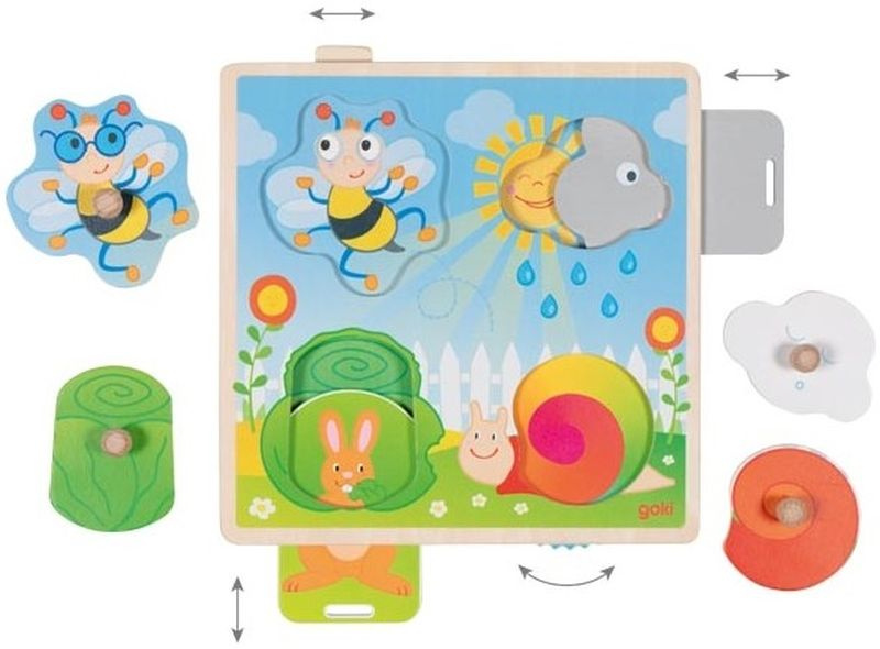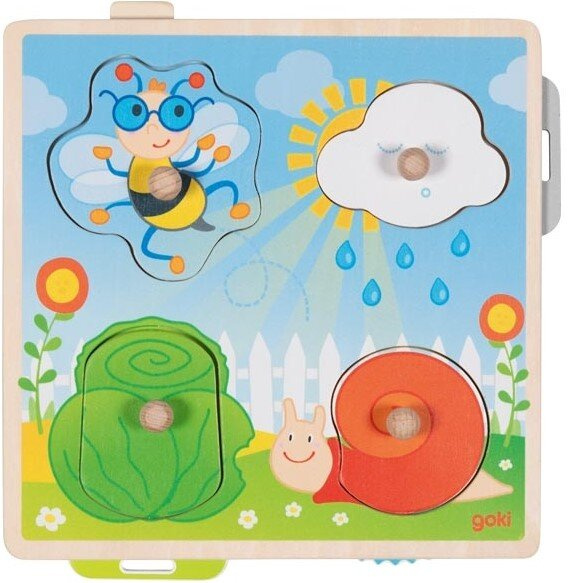 Drewniana układanka interaktywna Goki W ogrodzie skrywa ruchome elementy w postaci m.in. zakręconego ślimaka czy wyskakującego królika.