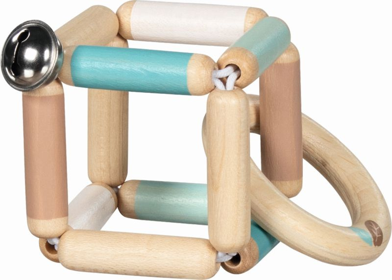 Ta grzechotka dla niemowlaka zaskakuje swą formą przestrzennej bryły. Krawędzie kostki wykonano z zaokrąglonego drewna w naturalnym odcieniu połączonego z niebieskimi dodatkami.