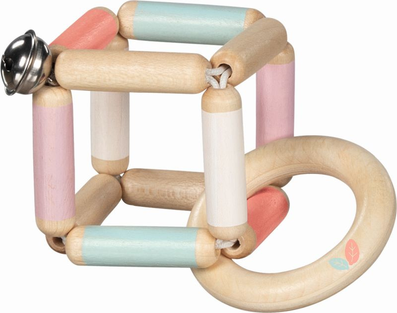 Ta grzechotka dla niemowlaka zaskakuje swą formą przestrzennej bryły. Krawędzie kostki wykonano z zaokrąglonego drewna w naturalnym odcieniu połączonego z pastelowymi dodatkami.