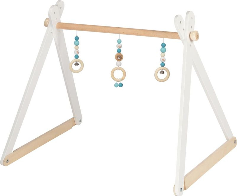 Baby Gym miś Goki to drewniana konstrukcja na trójkątnych podporach. Poprzeczka między nimi pozwala na zamocowanie 3 zawieszek w postaci sznurów koralików. Zawieszki kończą dzwoneczki.