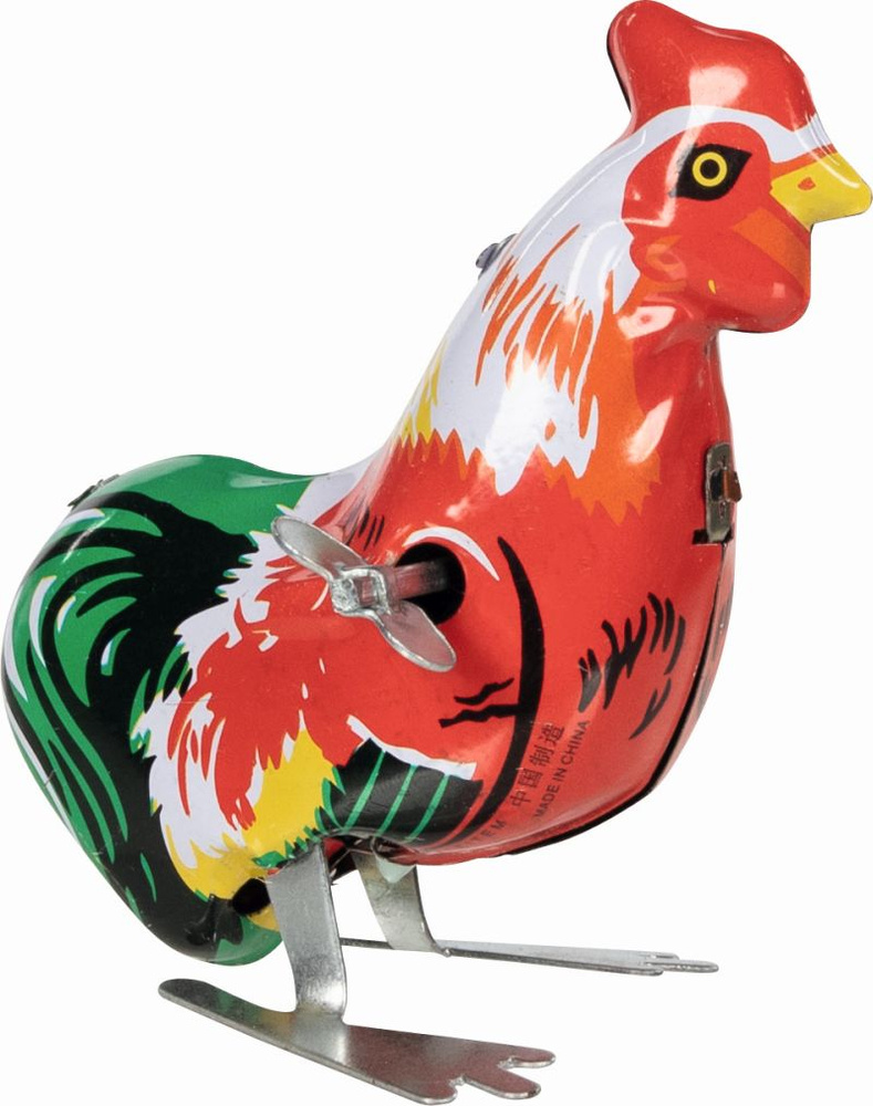 Zabawkowy nakręcany kogut wprawiany w ruch jest za pomocą zintegrowanego kluczyka.