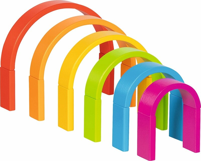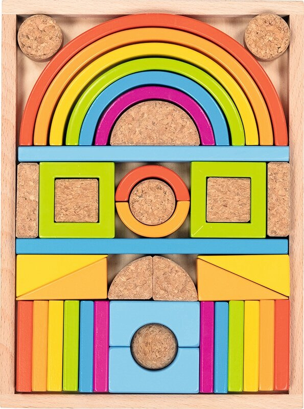 Układanka drewniana z pudełkiem marki Goki to propozycja dla dzieci pragnących wykazać się kreatywnością. Zestaw składa się łącznie z 41 elementów: 30 polakierowanych drewniany klocków w tęczowych barwach, 10 korkowych klocków w naturalnym kolorze, a także z drewnianego pudełka. Ta zabawka motoryczna oferuje dzieciom wiele możliwości, z klocków można stworzyć tęczę, kolorowy tunel dla autek lub inną ciekawą kompozycję, która może być też ozdobą dziecięcego pokoju. Dzięki tej układance dzieci nauczą się rozpoznawać kolory i kształty. To doskonały pomysł na prezent dla chłopca i dziewczynki.