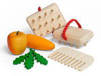 W skład zestawu wchodzą: 1 grzebień do curry, 1 szczotka, 1 grzebień do grzywy, 1 jabłko, 1 marchewka, 3 liście sałaty.