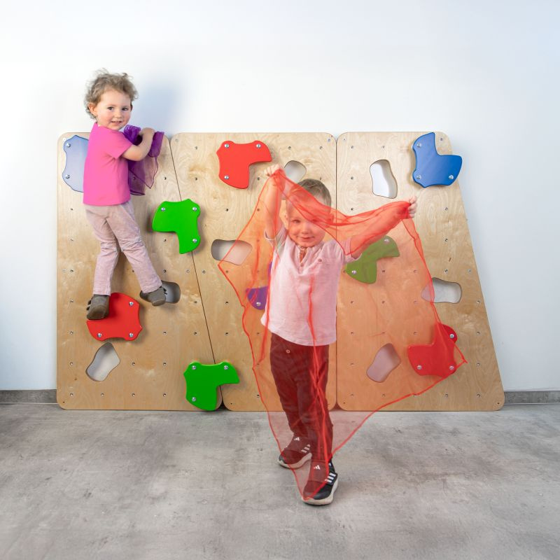 Każda ścianka jest wyposażona w wytrzymałe i bezpieczne uchwyty w różnych kolorach, co nie tylko ułatwia wspinaczkę, ale także zachęca dzieci do zabawy. Ścianki wykonane są z wysokiej jakości drewna i wytrzymują obciążenie do 70 kg. Dzięki temu mogą z nich korzystać dzieci już od 18. miesiąca życia, stopniowo rozwijając swoje umiejętności.