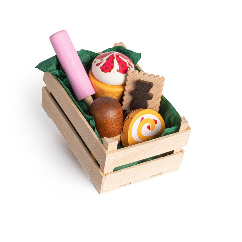 Z drewnianymi słodyczami zabawa nie ma końca, dzieci przygotują przepyszne desery dla swoich lalek i misiów. Może wykorzystać je także bawiąc się w sklep. Wystarczy położyć skrzyneczkę na sklepowej półce, aby ujrzeć jak szybko się sprzedają.