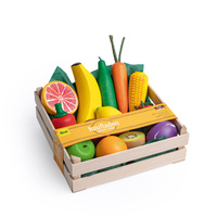 Z drewnianymi warzywami i owocami zabawa nie ma końca, dzieci przygotują przepyszne przekąski, dania i deserki dla swoich lalek i misiów. Może wykorzystać je także bawiąc się w sklep. Wystarczy położyć skrzyneczkę na sklepowej półce, aby ujrzeć jak szybko się sprzedają.