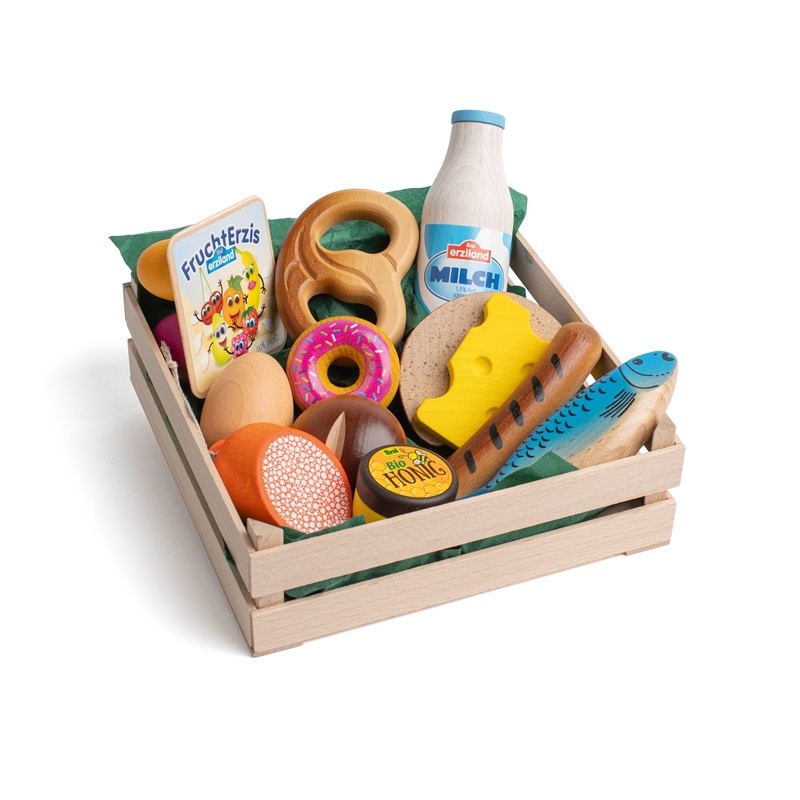 W skrzyneczce Erzi znajdziemy różne rodzaje smacznych produktów spożywczych (12 elementów). Elementy zabawki wykonane z drewna.
