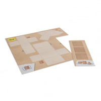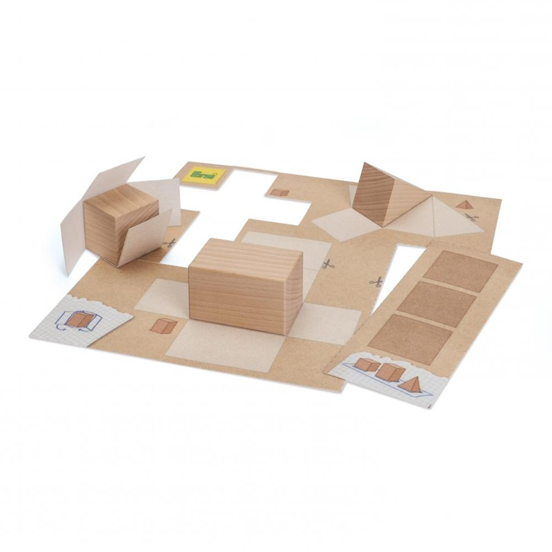 Bryły geometryczne wykonane są z litego drewna bukowego. Mają wysokość 10 lub 6 cm i bok o długości lub średnicę 6 cm. Dotykając brył geometrycznych, przypisuje się im odpowiednie właściwości. Wartość edukacyjną dodatkowo zwiększają odpowiednie powierzchnie, które można wyciąć, aby wykonać formy do brył. Można również porównywać widoki z boku i ich powierzchnie.