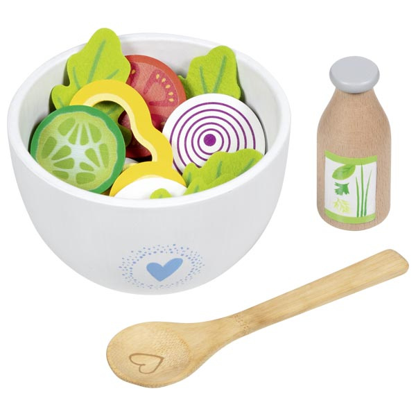 Kolorowe warzywa z drewna i filcu, miseczka, łyżka i buteleczka to wszystko, czego potrzeba do kulinarnej zabawy. Ten wyjątkowy zestaw do robienia sałatki Vitalbowl Goki wspiera kreatywność i rozwija wyobraźnię dzieci.