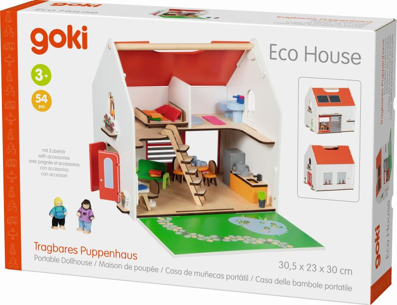 Nowoczesny design, naturalne drewno i bogate wyposażenie sprawiają, że drewniany przenośny domek dla lalek Eco House Goki stanie się ulubioną zabawką w domu i przedszkolu.