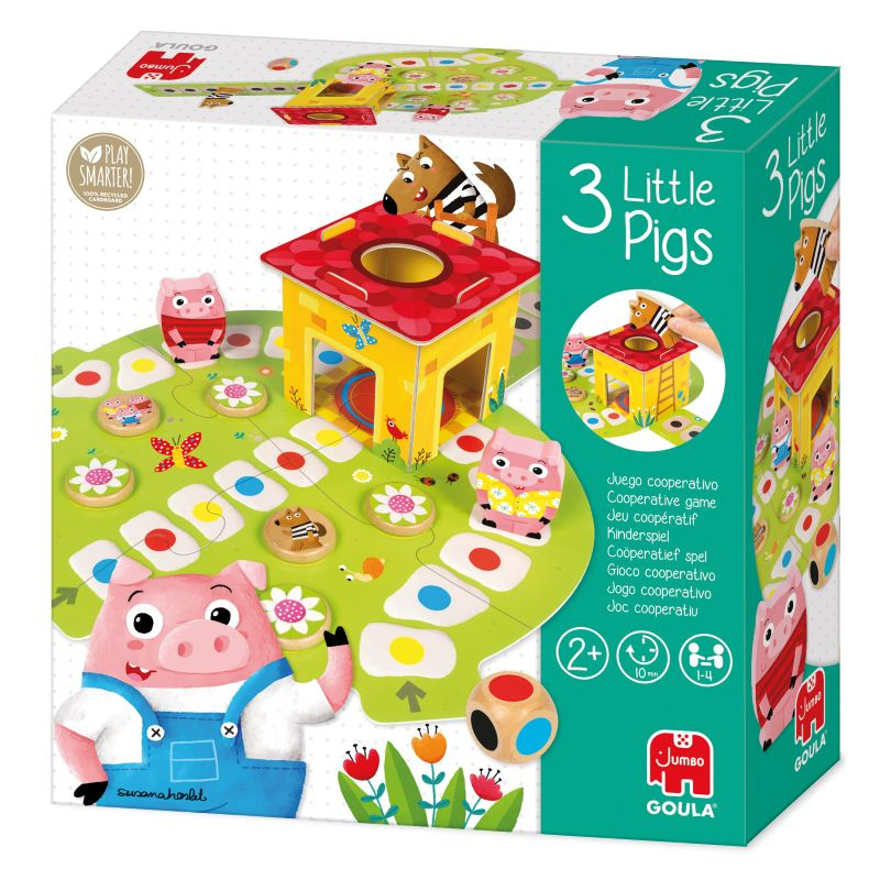 Czy świnki zdążą schować się w domku, zanim pojawi się wilk? Gra planszowa 3 małe świnki Goula to doskonały wybór dla dzieci od 2 roku życia. Proste zasady i dwa warianty zabawy sprawiają, że gra daje wiele możliwości rozgrywki. Dzieci mogą współpracować i wspólnymi siłami uratować bohaterów albo zmierzyć się w rywalizacji, kto szybciej dotrze do celu.