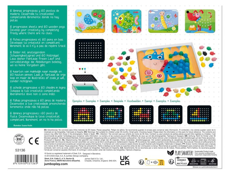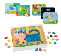 Dziecko może odwzorowywać obrazki lub tworzyć własne kompozycje, ucząc się przy tym rozpoznawania kolorów i ćwicząc precyzję ruchów. układanka została wykonana z bezpiecznego, certyfikowanego drewna, dzięki czemu gwarantuje trwałość i komfort zabawy nawet dla kilku pokoleń.