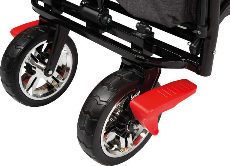 - Stabilna konstrukcja z szerokimi kołami i hamulcami