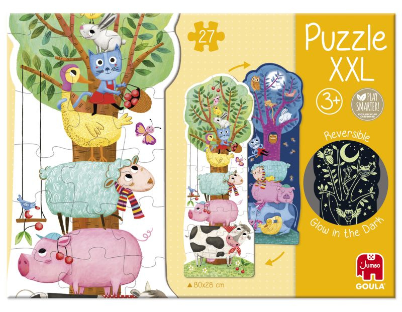 Dwustronne puzzle dla dzieci XXL Farma Dzień i Noc Goula to wspaniała układanka, która uczy i bawi. Dziecko układa 27 dużych elementów, tworząc scenę pełną zwierząt w dwóch wersjach: dziennej i nocnej. Po naświetleniu puzzle świecą w ciemności, co dodaje zabawie wyjątkowego uroku. Puzzle rozwijają spostrzegawczość, koordynację wzrokowo-ruchową i logiczne myślenie. Zestaw wykonany jest z grubego kartonu, idealnego dla małych rączek.