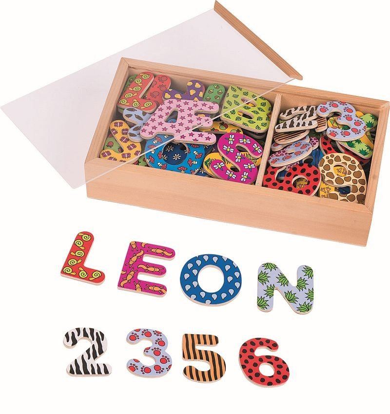 Zestaw 88 drewnianych magnesów w postaci kolorowych literek oraz cyferek umieszczonych w drewnianym pudełku.